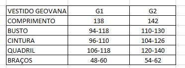 Tabela de medidas: Primeira medida em repouso- Segunda esticada manualmente